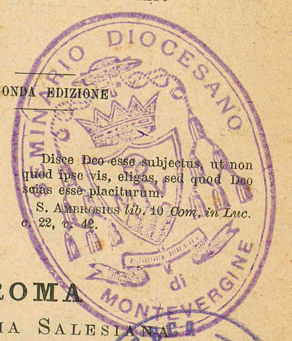Si tratta di note di possesso o timbri che richiamano genericamente Montevergine, apposte su libri di studio dagli studenti del Seminario, oppure allo scopo di riaffermare l’appartenenza dei volumi stessi alla ricca biblioteca della Congregazione. D’altra parte, lo studio sistematico e rigoroso faceva parte della formazione dei monaci di Montevergine, obbligati all’osservanza delle disposizioni impartite nella Regola, di cui la declinazione più famosa è riassunta nel noto adagio ora, lege et labora